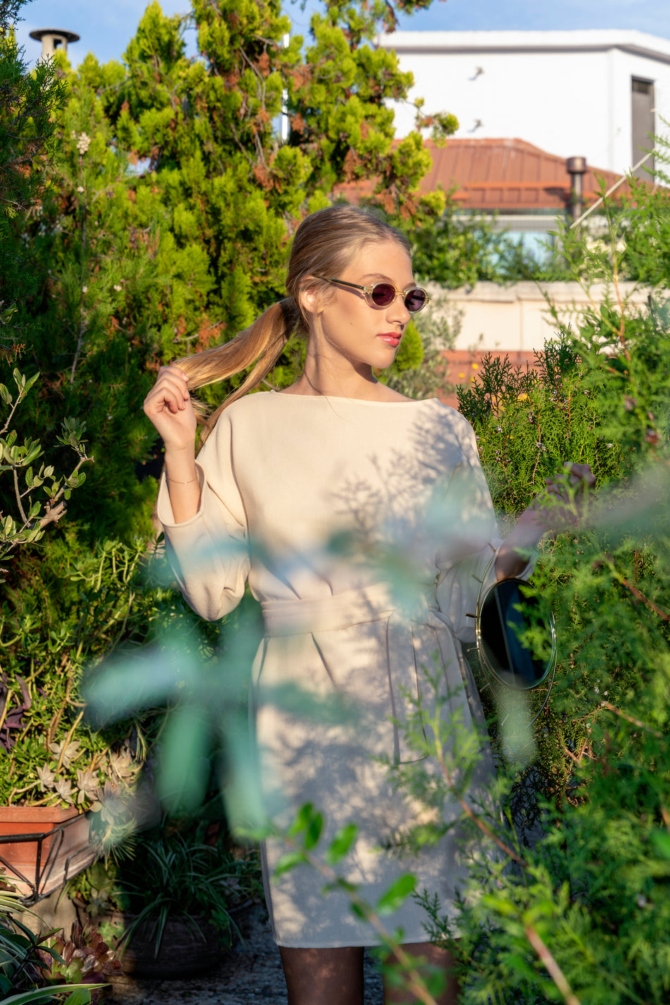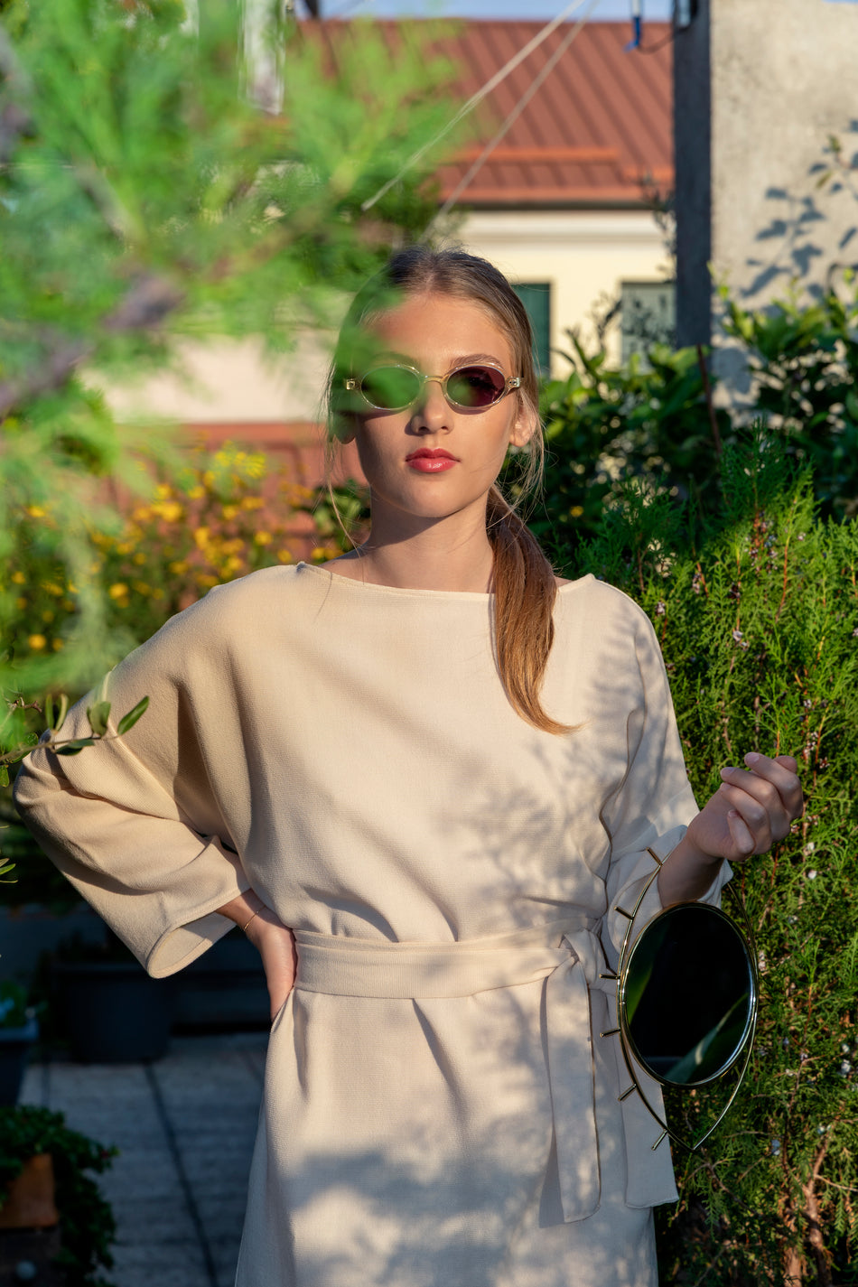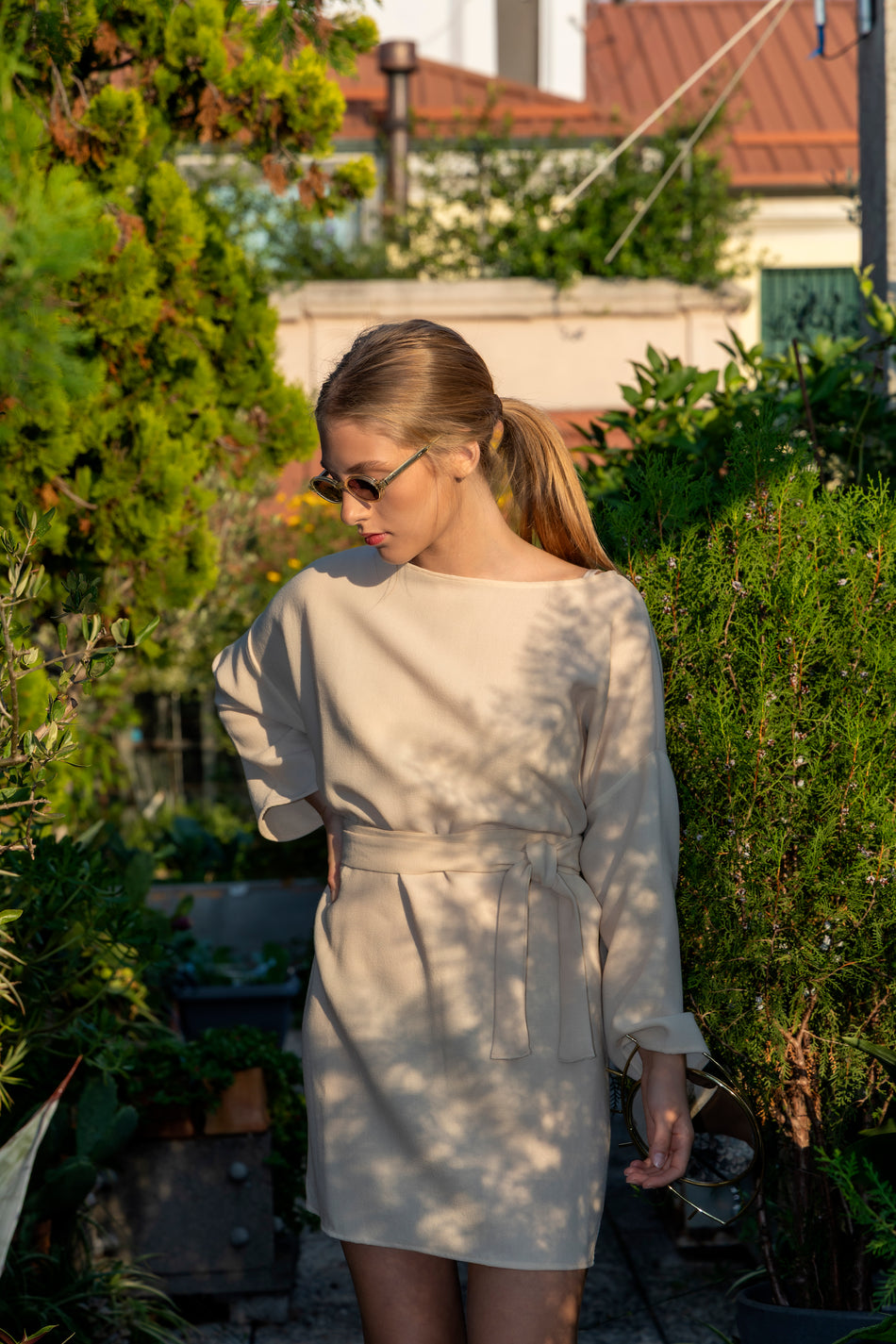 Abito Perfetto nella tonalità del panna dalla linea geometrica a rettangolo. Con passanti e cintura dello stesso tessuto lunga circa 3mt da avvolgere in vita.